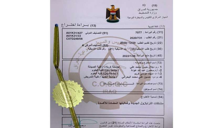 براءة اختراع مشتركة بين جامعات كربلاء وبابل والعميد حول مشتقات الترايازول الجديدة وفعاليتها المضادة للأكسدة