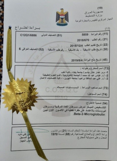 حصل التدريسيون في كلية الطب بجامعة بغداد عمار عادل جاسم وفي الجامعة التكنولوجية الدكتور عباس عبد الله محمد, وفي جامعة النهرين الدكتور علي عبد الحافظ, على براءة اختراع عن التشخيص المبكر لمرض سرطان الغدة الدرقية وسرطان البروستات.