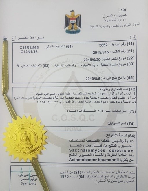 حصل فريق بحثي مشترك من جامعتي بغداد والمستنصرية على براءة اختراع مشتركة عن الفعالية التثبيطية للمستحلب المنتج من خميرة الخبز.