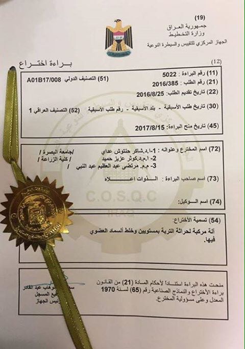 حصل التدريسيون في كلية الزراعة بجامعة البصرة الدكتور شاكر حنتوش عداي والدكتورة كوثر عزيز حميد ومرتضى عبد العظيم عبد النبي على براءة اختراع عن الآلة المركبة لحراثة التربة بمستويين وخلط السماد العضوي فيها.