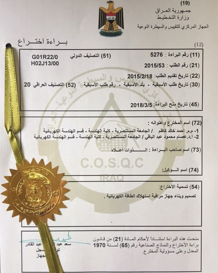 حصل التدريسيان في كلية الهندسة بالجامعة المستنصرية الدكتور عصام محمود عبد الباقي والباحث أحمد خالد كاظم، على براءة إختراع لتمكنها من تصميم وبناء جهاز جديد لمراقبة استهلاك الطاقة الكهربائية.