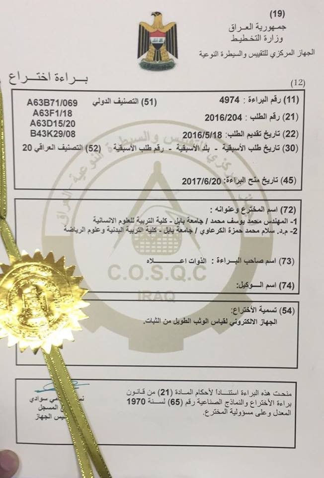 حصل تدريسيان من كلية التربية في جامعة بابل, على براءة اختراع حول تصنيع جهاز الكتروني لقياس الوثب الطويل من الثبات الممنوحة من الجهاز المركزي للتقييس والسيطرة النوعية.