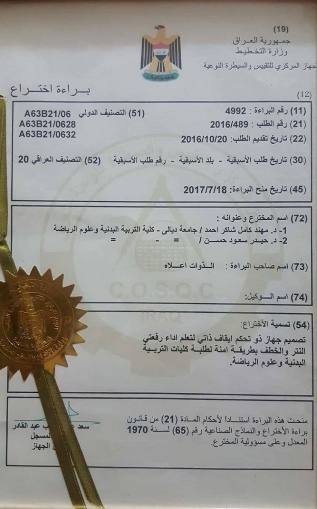 حصل التدريسيان في كلية التربية البدنية وعلوم الرياضة بجامعة ديالى الدكتور مهند كامل شاكر والدكتور حيدر سعود حسن على براءة اختراع لتصميمهما جهازا لتعليم رفعتي الخطف والنتر.