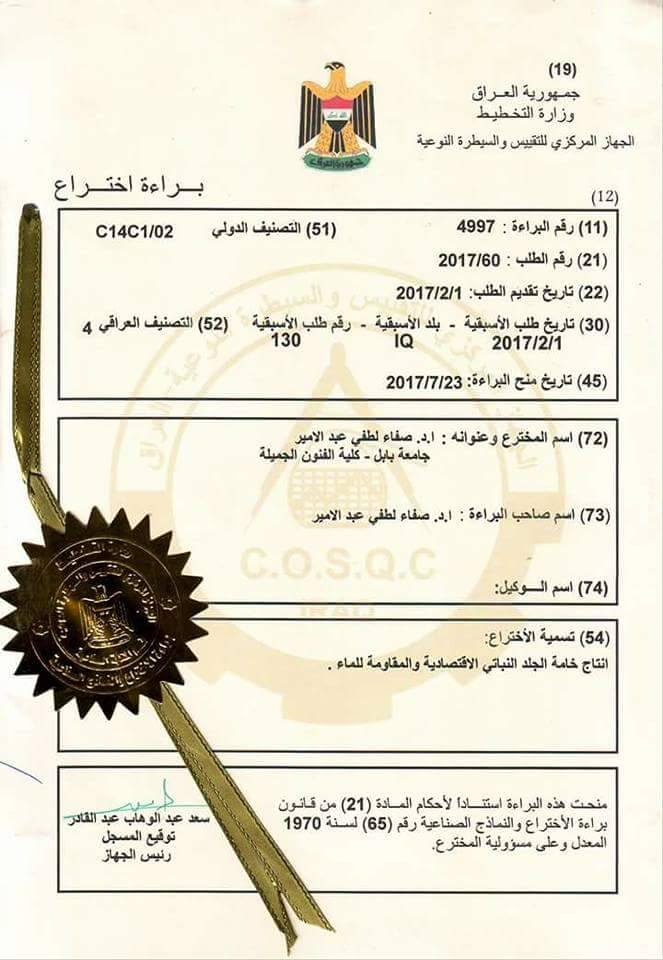 حصلت التدريسية في كلية الفنون الجميلة بجامعة بابل الدكتورة صفا لطفي، على براءة اختراع من الجهاز المركزي للتقييس والسيطرة النوعية التابع لوزارة التخطيط، عن إنتاج خامة الجلد النباتي من النخيل.