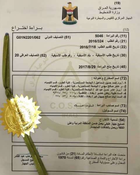 حصل التدريسيون في كلية العلوم بالجامعة المستنصرية الدكتور احمد حسين إسماعيل والدكتور عامر حسن عبد الله والباحث عامر صالح مهدي، على براءة الاختراع عن تصنيع جهاز طيفي يعمل ضمن المنطقة المرئية واطئة الكلفة معتمدا على الطاقات المتجددة.