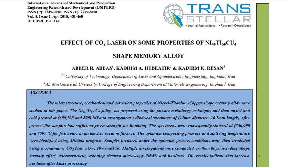 نشر التدريسي في كلية الهندسة بالجامعة المستنصرية الدكتور كاظم كامل رسن، بحثاً علميا عن تأثير ليزر نوع ثاني أوكسيد الكاربون في بعض خواص سبيكة نيكل كاربون نحاس الذاكرة للشكل.