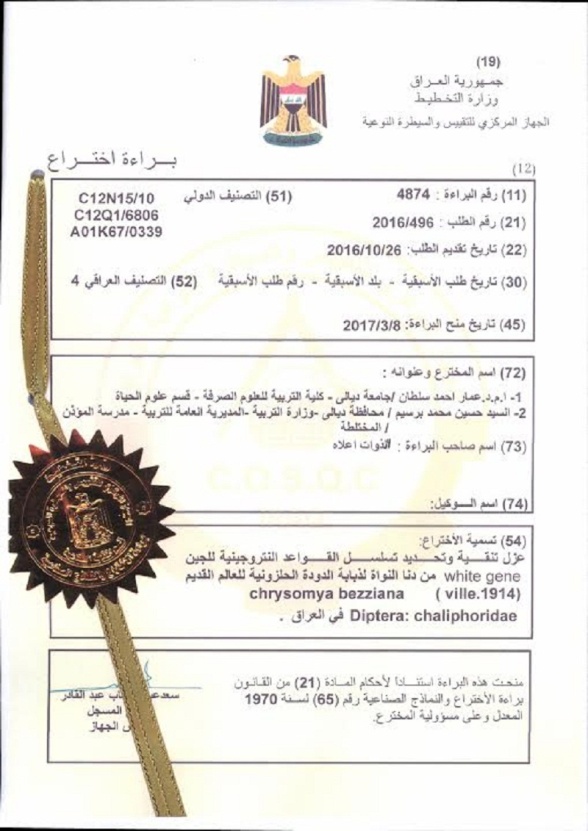 حصل التدريسي في جامعة ديالى الدكتور عمار احمد سلطان على براءة اختراع من الجهاز المركزي للتقييس والسيطرة النوعية عن عزل وتنقية وتحديد تسلسل القواعد النتروجينية للجين White gene من دنا النواة لذبابة الدودة الحلزونية للعالم القديم .