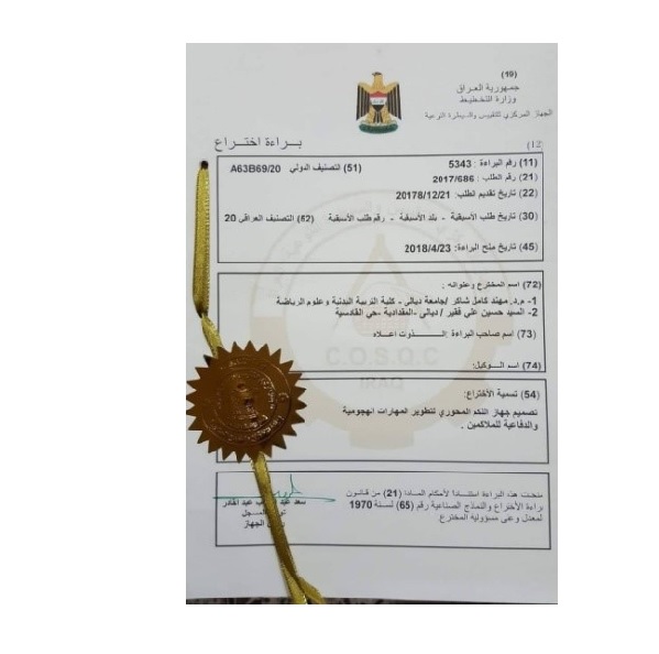 حصل التدريسي في كلية التربية البدنية وعلوم الرياضة بجامعة ديالى الدكتور مهند كامل شاكر على براءة اختراع, عن تصميم جهاز اللكم المحوري لتطوير المهارات الهجومية والدفاعية للملاكمين. وتضمنت البراءة الممنوحة من الجهاز المركزي للتقييس والسيطرة النوعية, تصميم جهاز تدريبي يجمع المهارات الأساسية التي يستعملها الملاكم خلال النزال وهي الهجومية والدفاعية المستعملة للتدريب. وتعمل البراءة على تطوير الجوانب التدريبية والبدنية والمهارية من خلال الية ميكانيكية تعمل من خلال كيس لكم يدور عند توجيه اللكم له بسرعة دوران مختلفة على حسب قوة اللكم بزاوية 360 درجة وعلى كلا الاتجاهين.