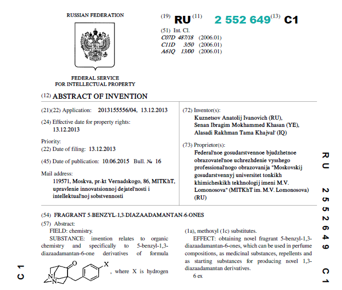 وتضمنت البراءة المشتركة للتدريسي في كلية العلوم بجامعة كربلاء الدكتور رحمن طعمه, والدكتور كوزنيتسوف أناتولي إيفانوفيتش من جامعة موسكو التكنولوجيا الروسية, والممنوحة من وزارة العلوم والتكنلوجيا الروسية، تحضير مضادات حيوية عبارة عن مركبات عضوية متعددة الحلقات تسمى (مشتقات الازاء ادمنتان) حيث تمتلك مشتقات حلقة الادمنتان فعالية بايلوجية ضد البكتريا والفايروسات.