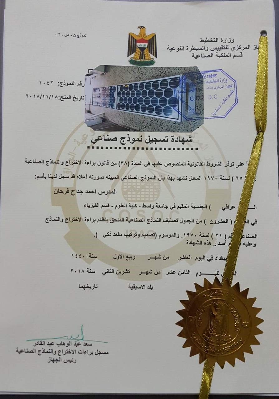 حصل التدريسي كلية العلوم في جامعة واسط احمد جداح على شهادة تسجيل نموذج صناعي بتصميم وتركيبه مقعد ذكي, الممنوحة من وزارة التخطيط .