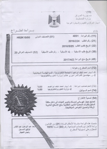 حصل التدريسي من قسم الهندسة الميكانيكية في الجامعة التكنولوجية الدكتور احمد نايف إبراهيم على براءة اختراع عن تصنيع جهاز كهربائي يزيد من انتظامية الاسطح الدائرية.