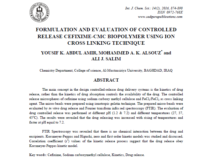 ويهدف البحث الذي حمل عنوان (الاطلاق المنتظم لعلاج السيفكسيم بواسطة بوليمرات حيوية) إلى دراسة قابلية بعض البوليمرات الحيوية (الصوديوم كاربوكسي مثيل سليلوز على اطلاق علاج السيفكسيم بواسطة التشابك الأيوني.