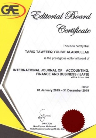 أعلنت كلية الإدارة والاقتصاد في جامعة البصرة, اختيار التدريسي الدكتور طارق توفيق , عضواً ومقوماً علمياً في المجلة الدولية للمحاسبة والمالية والأعمال الماليزية.
