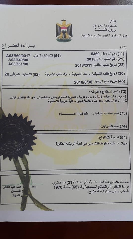 حصل التدريسي في كلية التربية الأساسية بجامعة ديالى الدكتور فرات جبار سعدالله على براءة اختراع عن تصميم جهاز مراقب خطوط الكتروني في لعبة الريشة الطائرة.
