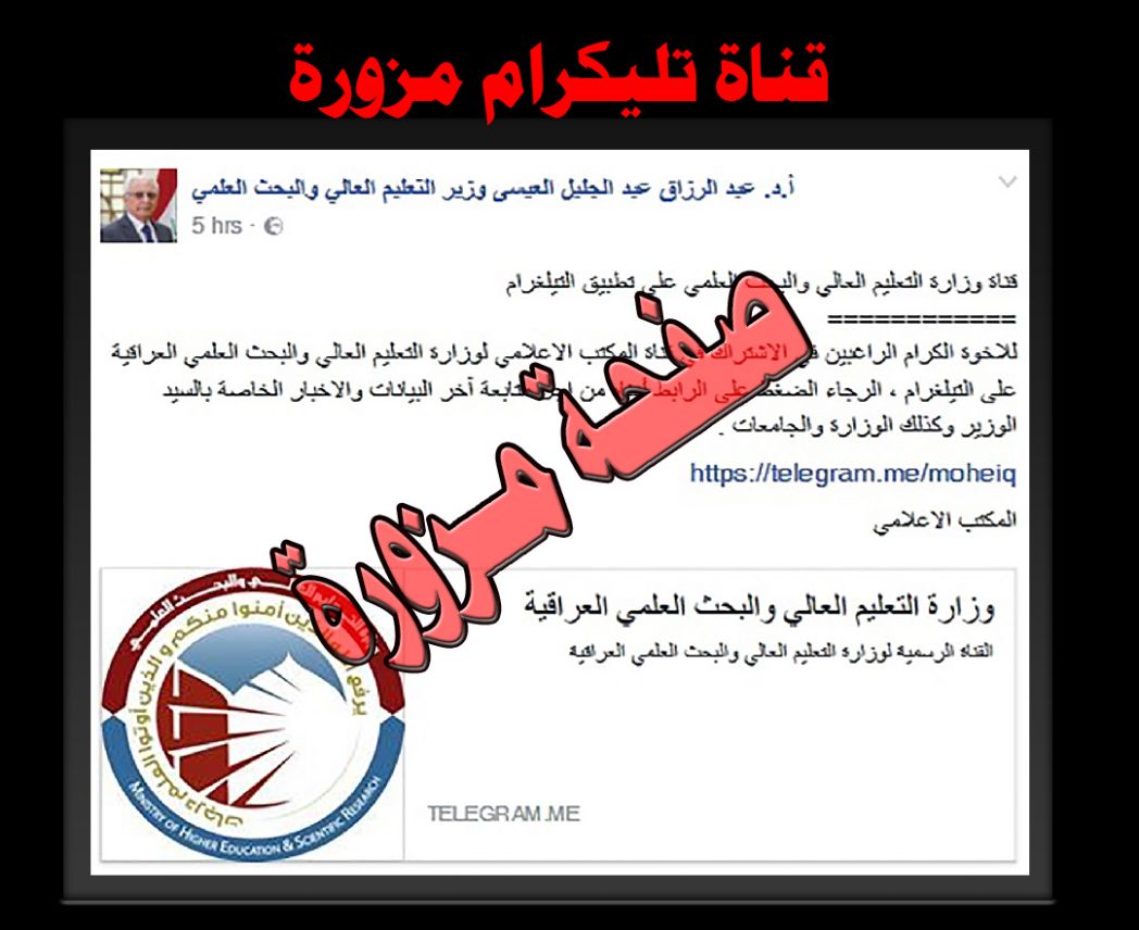 تنفي وزارة التعليم العالي والبحث العلمي صلتها باي قناة تلكرام تحمل اسمها وتلفت عناية التدريسيين والطلبة ومتابعي قرارات التعليم العالي الى توخي الحذر من هذه القناة المزورة ومنشوراتها الوهمية وتدعو الى اعتماد أخبار الوزارة عبر موقعها الالكتروني الرسمي ومصادرها المخولة بالتصريح لوسائل الاعلام والرأي العام.