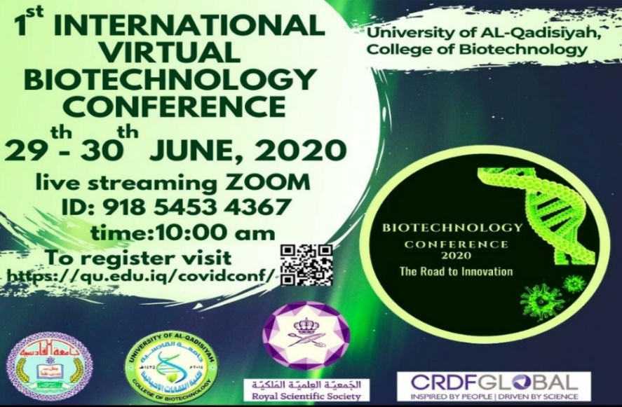 عقدت كلية التقانات الاحيائية في جامعة القادسية، مؤتمرها الدولي العلمي الافتراضي عن التقانات الاحيائية في زمن جائحة كورونا المستجدة بمشاركة باحثين من مختلف دول العالم وعبر منصة زوم.
