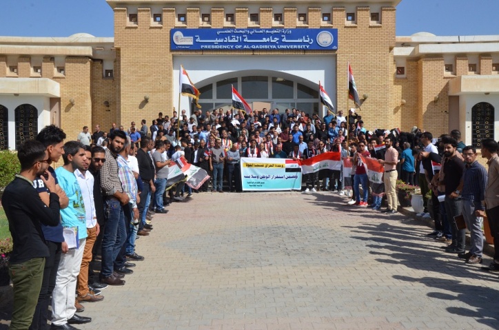وقال رئيس جامعة القادسية الدكتورة فردوس عباس جابر الطريحي، إن هذه الوقفة تاتي ضد كل محاولات النيل من وحدة النسيج المجتمعي وللتعبير عن وحدة العراق ارضا وشعبا.