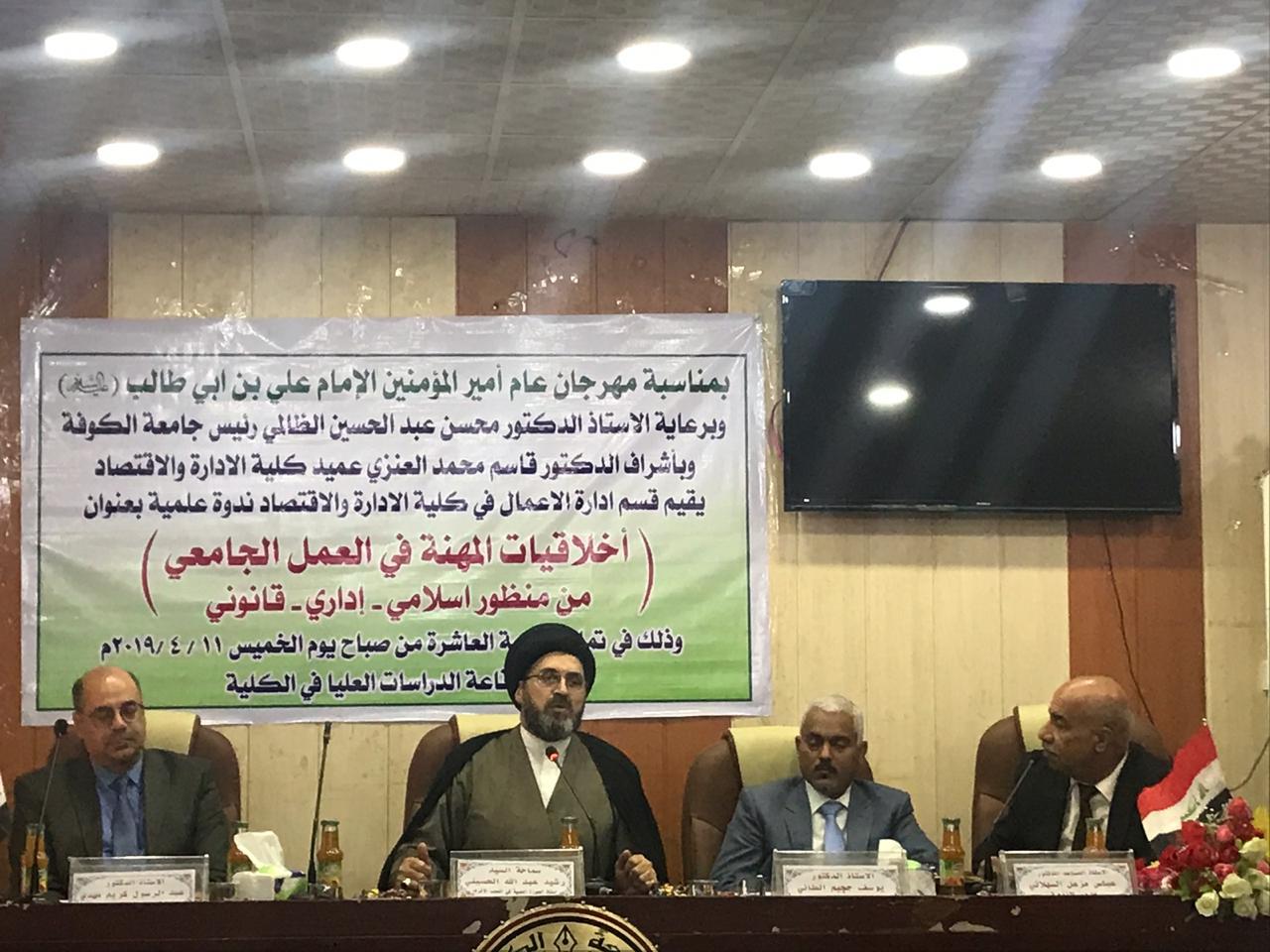 نظمت كلية الادارة والاقتصاد في جامعة الكوفة، ندوة علمية عن اخلاقيات المهنة في العمل الجامعي بمشاركة عدد من الباحثين والمختصين. وتضمنت الندوة التي اقيمت على هامش مهرجان عام امير المؤمنين علي بن ابي طالب عليهم السلام، ثلاث محاور رئيسه تناول المحور الاول بحث للعلامة السيد رشيد الحسيني تناول فيه الابعاد الاخلاقية للعمل الجامعي وفق المنظور الاسلامي ودوره في التاثير على سلوكيات الاشخاص بشكل ايجابي عبر التميّز في الأفكار والابتكارات والاحترام المنافسة الشريفة. وتناول المحور الثاني بحث علمي للدكتور يوسف حجيم الطائي تطرق خلاله الى اخلاقيات المهنة وفق المنظور الاداري مبيناً اهم المصادر العلمية التي تدل على السلوك الاخلاقي المهني للهيئه التدريسيه مستشهداً بأهم التجارب العالميه بذلك. واما المحور الثالث كان بحث للدكتور عبد الرسول ابو صيبع بين فيه الاطر القانونيه الخاصه بالنظم والتعليمات التي اهتمت باخلاقيات المهنة والتي تؤثر في السلوك الفرد. واوصت الندوة بضرورة الابتعاد عن التجاذبات السياسية ونبذ الفساد ورسم استراتيجية طويلة الأمد ووضع خطط مدروسة قوامها الأخلاقيات والحوكمة الجيدة والشفافية والبنية القوية.