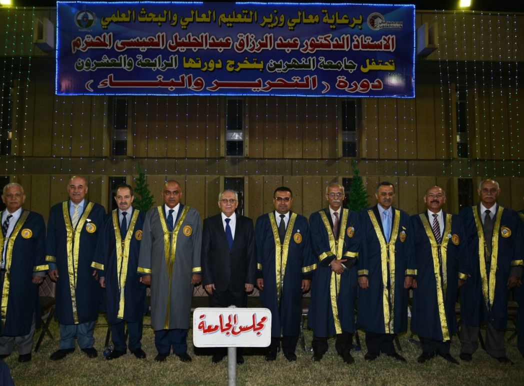 احتفلت جامعة النهرين بتخرج دورتها الرابعة والعشرين بحضور وزير التعليم العالي والبحث العلمي الاستاذ الدكتور عبد الرزاق العيسى وعدد من الشخصيات النيابية والسياسية.