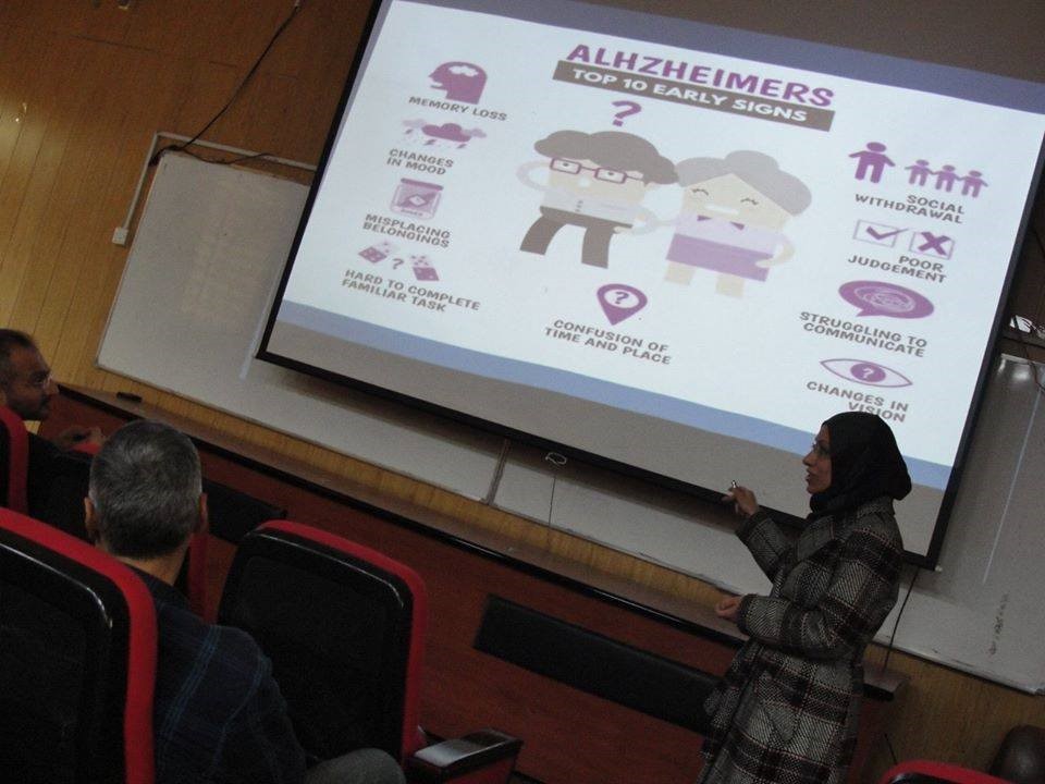 وتضمنت الندوة محاضرة قدمها الدكتور ظافر قحطان، بين خلالها أن الزهايمر مرض عصبي مزمن يظهر عند المسنين ويعرف بخرف الشيخوخة، يصيب المخ ويسبب فقدان الذاكرة قصيرة الأمد وعدم القدرة على التركيز والتعلم، وفقدان القدرة على العناية بالنفس، وقد يؤدي الى تدهور خلايا المخ وبالتالي موتها.