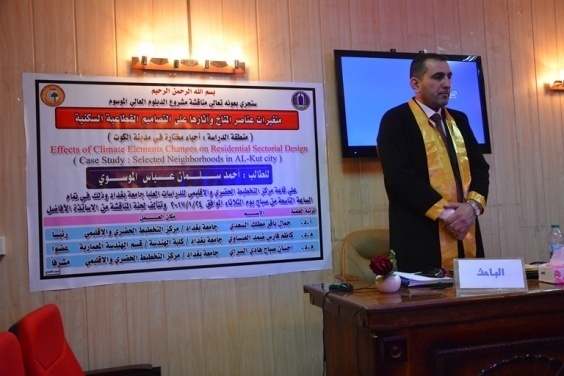 ناقش مركز التخطيط الحضري والاقليمي للدراسات العليا في جامعة بغداد, بحث دبلوم عال عن متغيرات عناصر المناخ وآثرها في التصاميم القطاعية السكنية.