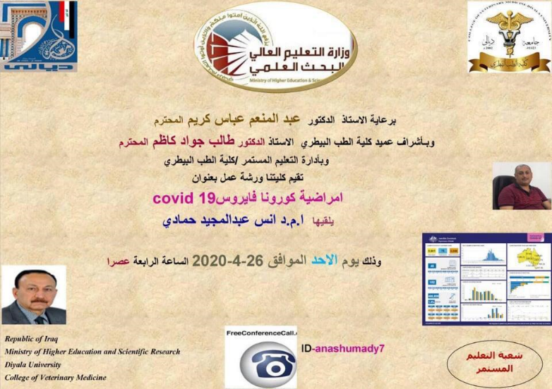 اقامت كلية الطب البيطري في جامعة ديالى ورشة عمل عن إمراضية فيروس كورونا عبر برنامج Free conference call.