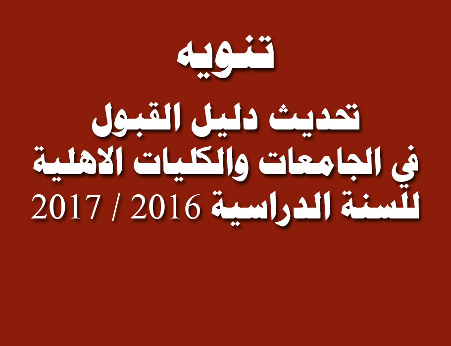 تعلن دائرة الاعلام والعلاقات في وزارة التعليم العالي والبحث العلمي تحديث دليل الطالب للقبول في الجامعات والكليات الاهلية للسنة الدراسية ٢٠١٧/٢٠١٦