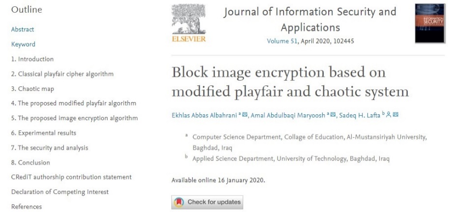 وتضمنت الدراسة التي تم نشرها في مجلة أمن المعلومات والتطبيقات المُصَنَفَة ضمن مستوعبي كلارفيت وسكوباس، تشفير الصور الملونة وفقاً لنظرية الفوضى في عمليات (diffusion) و(confusion)، حيث تم إجراء عملية (diffusion) باستخدام (cross map) لبعثرة للبكسلات في كل (band) من الصورة، كما تم تنفيذ عملية (confusion) من خلال خوارزمية (Playfair) المعدلة.