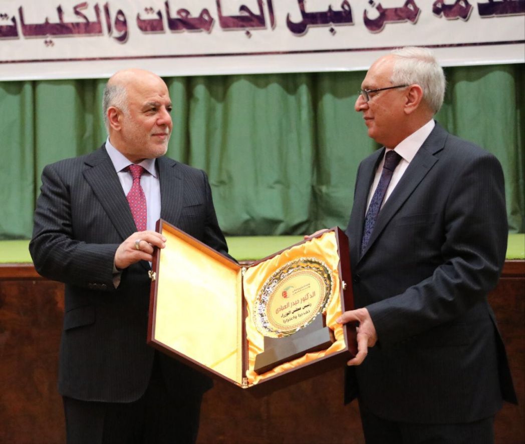 وقدم وزير التعليم العالي والبحث العلمي الدكتور عبد الرزاق العيسي درع الوزارة الى دولة رئيس الوزراء الدكتور حيدر العبادي تثمينا لمواقفه الداعمة لمسيرة التعليم العالي في العراق ورعايته الطلبة المتفوقين.