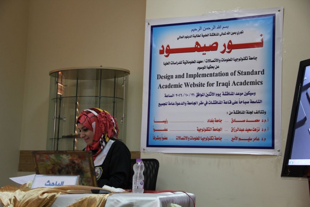 بحثت رسالة دبلوم عالي في معهد المعلوماتية للدراسات العليا في جامعة تكنولوجيا المعلومات والاتصالات، تصميم وتنفيذ موقع الكتروني يقوم بإنشاء مواقع شخصية قياسية للأكاديميين العراقيين للطالبة نور صيهود عبد الرزاق .