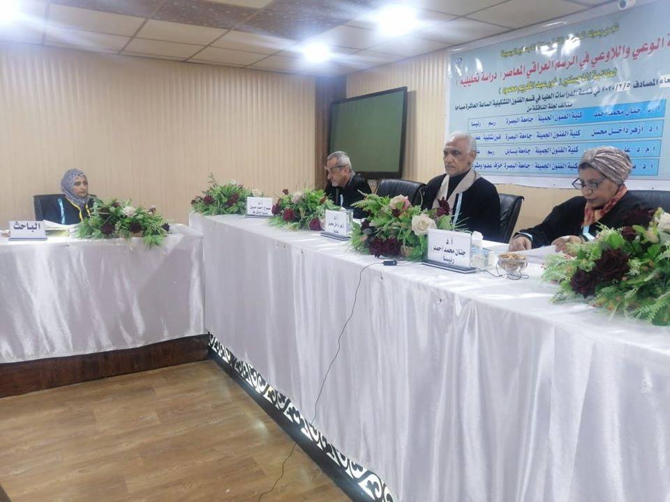 وتضمنت الرسالة التي قدمتها الطالبة نور عبد الكريم محمود، أربعة فصول تضمن الفصل الأول مشكلة البحث وما نتج عن الوعي واللاوعي في الفن عبر تناول اعمال الفن العراقي المعاصر