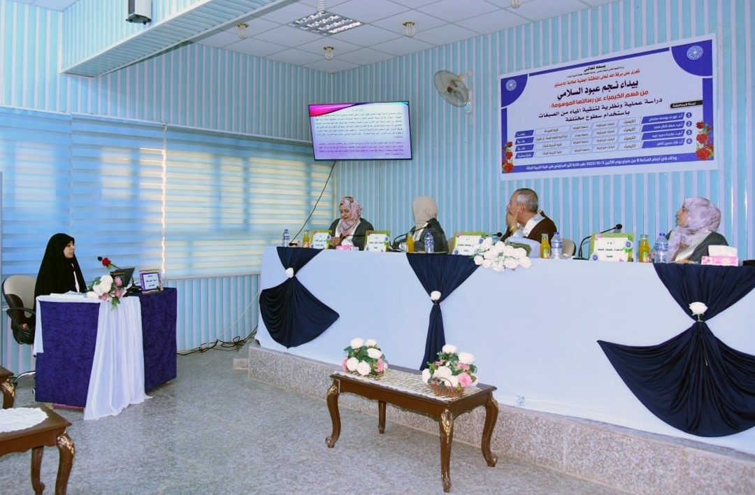 بحثت رسالة ماجستير في كلية التربية للبنات بجامعة الكوفة تنقيةِ المياهِ مِن الصبغات باستخدامِ سطوحٍ مُختلفة.