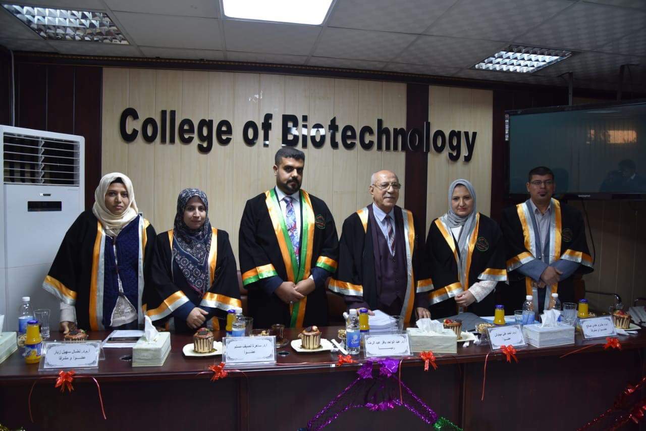 ناقشت رسالة ماجستير في جامعة النهرين، طرق انتاج وتنقية البروتيز من العزلة المطفرة لبكتيريا الزائفة الزنجارية، للطالب حسين عواد حسين.
