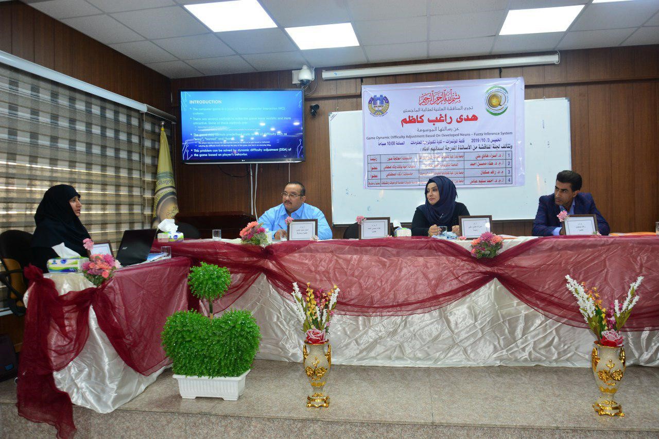 ناقشت رسالة ماجستير في جامعة بابل، تعديل صعوبة اللعبة ديناميكيا بالاعتماد على نظام الاستنتاج الضبابي المطور، للطالبة هدى راغب كاظم.