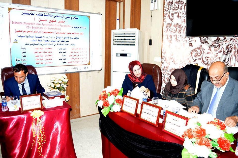 وتناولت رسالة الطالب مثنى فليح حسن دراسة تعريف التدخين الذي يعدّ سببا لزيادة كوليسترول البروتين الدهني واطئ الكثافة (LDL-C)، والدهون الثلاثية في البلازما (TG) ومستويات كوليسترول البروتين الدهني منخفضة الكثافة جدا VLDL-C.