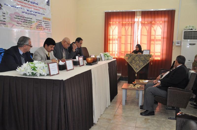 ناقشت رسالة ماجستير في كلية العلوم بجامعة ديالى، تصنيع خلية شمسية صبغية وتعزيز كفاءتها بتحسين معلمات التحضير، للطالبة شيماء مفيد جاسم .