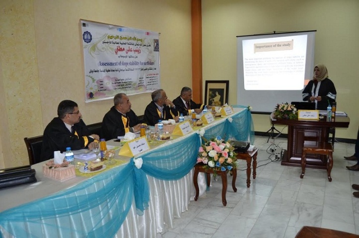 ناقشت رسالة ماجستير في كلية الهندسة بجامعة ديالى، تقييم استقرارية الميل للسدود الترابية، للطالبة زينب علي مطني .