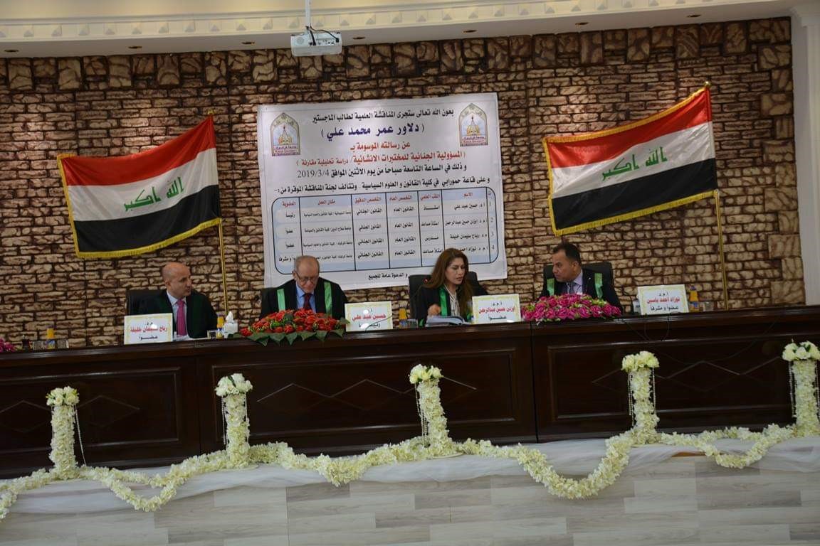 ناقشت رسالة الماجستير في كلية القانون والعلوم السياسية بجامعة كركوك، المسؤولية الجنائية للمختبرات الانشائية/دراسة تحليلية مقارنة .