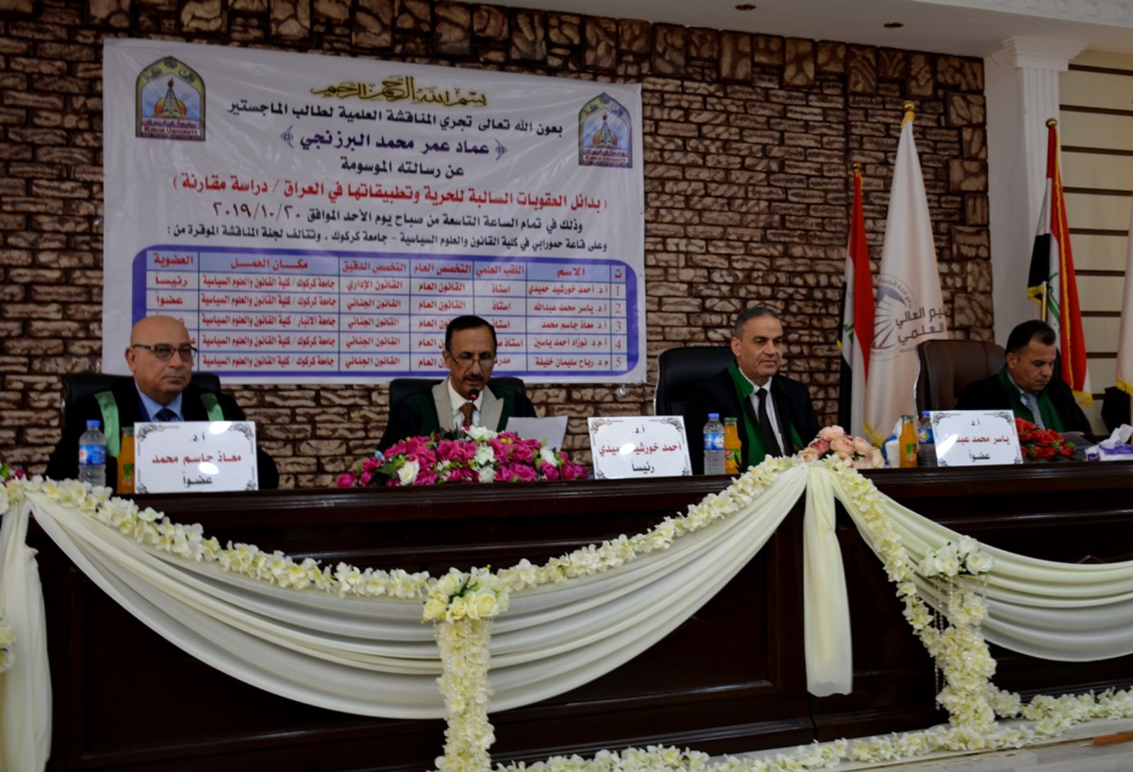 ناقشت رسالة ماجستير في كلية القانون والعلوم السياسية بجامعة كركوك، بدائل العقوبات السالبة للحرية وتطبيقاتها في العراق.