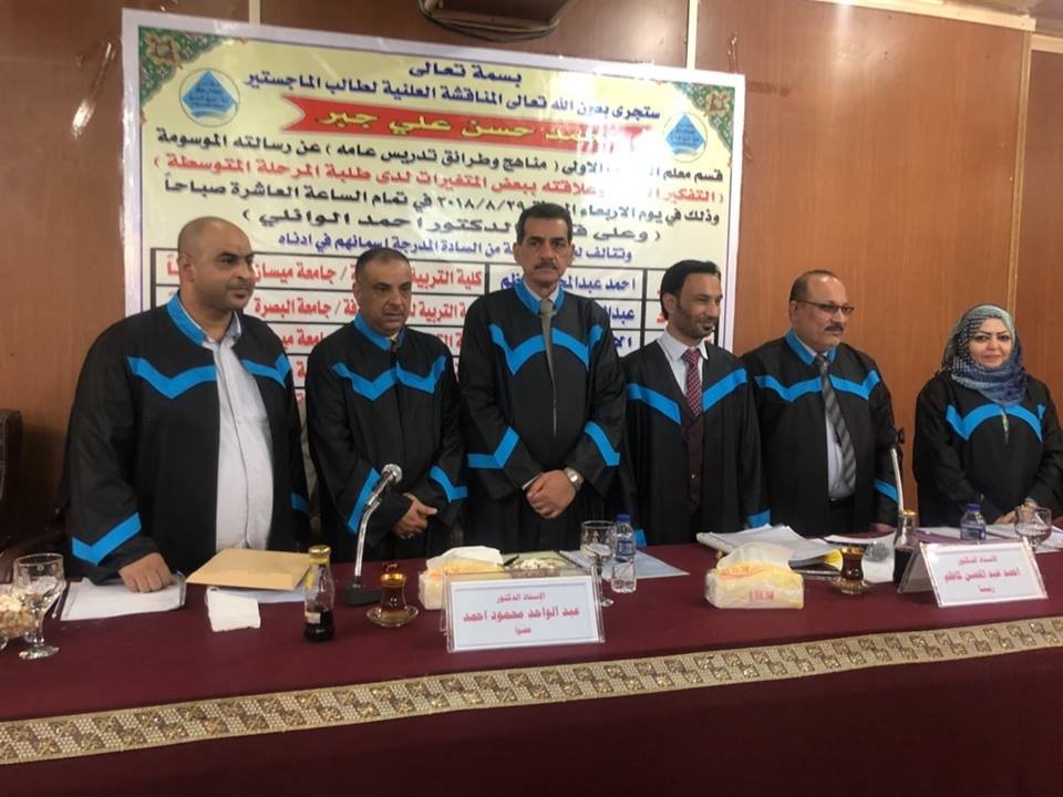 ناقشت رسالة ماجستير في كلية التربية البدنية وعلوم الرياضة بجامعة ميسان, التفكير الجبري وعلاقته ببعض المتغيرات لدى طلبة المرحلة المتوسطة.