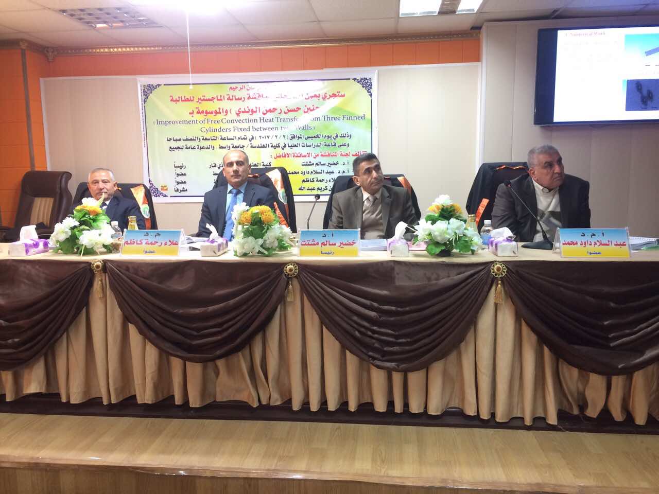 ناقشت رسالة ماجستير في كلية الهندسة بجامعة واسط, استعمال ثلاث اسطوانات مزعنفة من الفولاذ، لتحسين الانتقال الحر للحرارة, للطالبة حنين حسن.
