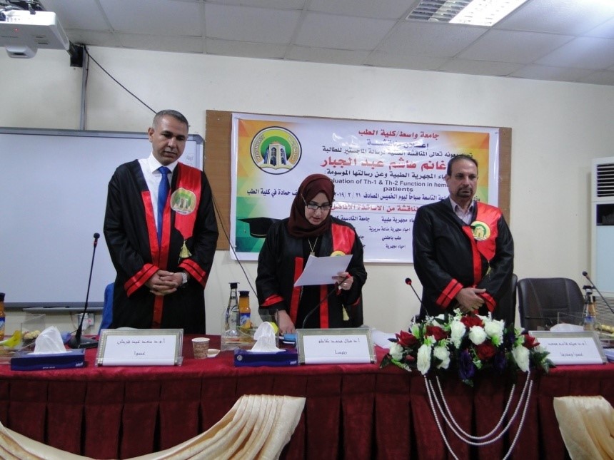 ناقشت رسالة ماجستير في كلية الطب بجامعة واسط، تقييم فعالية الخلايا اللمفاوية Th1, Th2 عند مرضى الغسل الكلوي الدموي قبل الغسل وبعده.