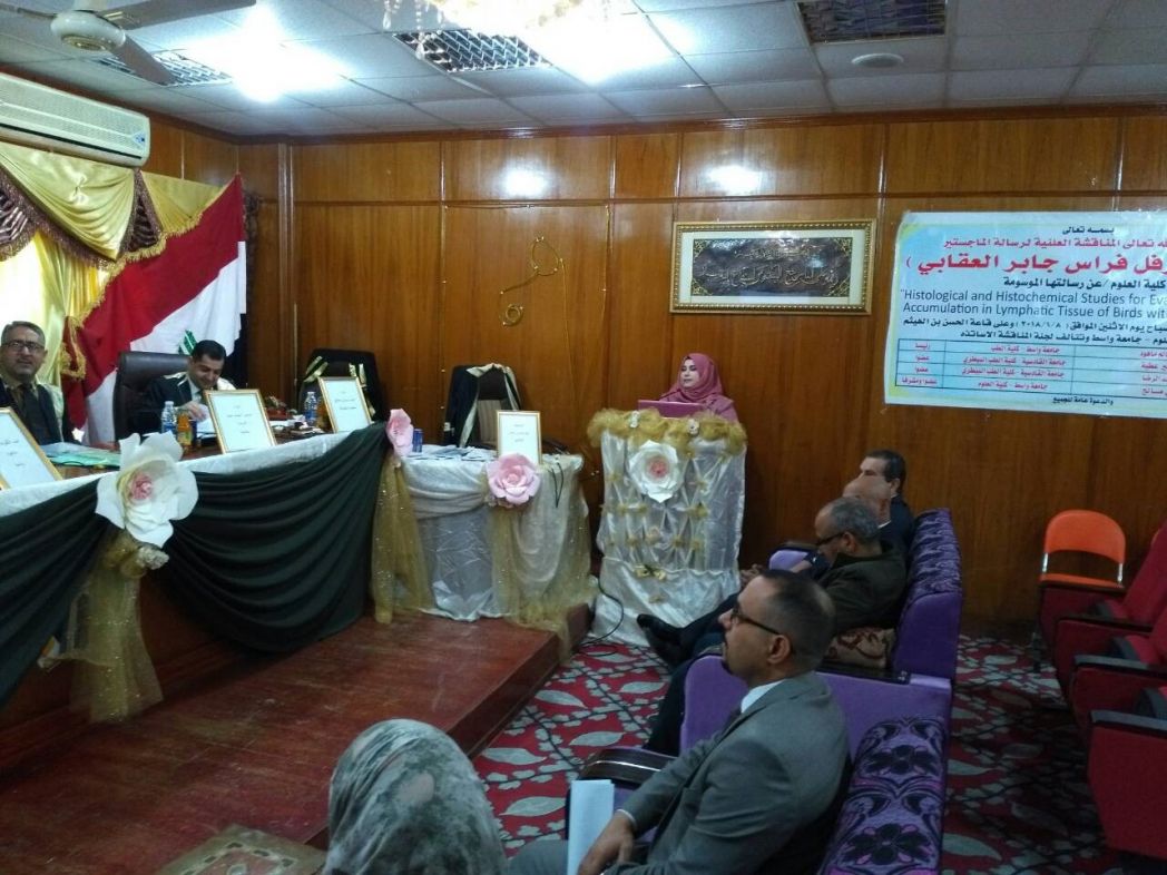 ناقشت رسالة ماجستير في كلية العلوم بجامعة واسط، نسيجية وكيميائية تراكم الدهون في الأنسجة اللمفاوية في الطيور ضمن المناطق الملوثة، للطالبة رفل فراس جابر .