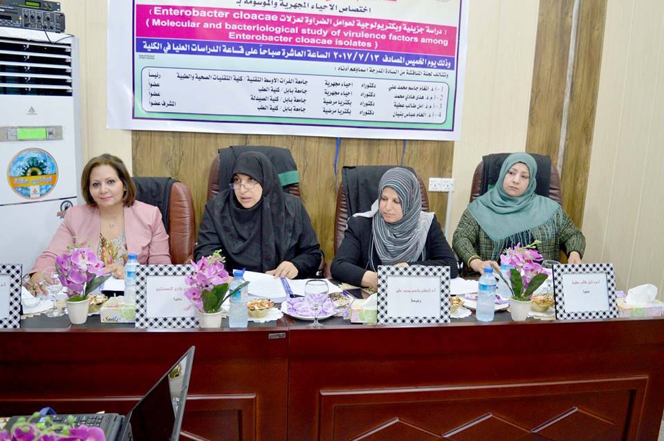 ناقشت رسالة ماجستير في كلية الطب بجامعة بابل، دراسة جزيئية وبكتيرية عن بعض عوامل الضراوة لبكتريا Enterobacter cloacae، للطالب قاسم علي جاسم الخزاعي.