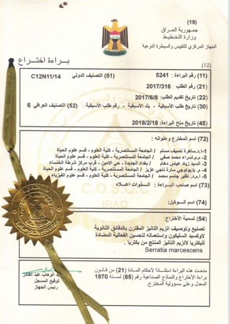 وتضمنت البراءة،التي تألف فريقها البحثي من الدكتورة ساهرة نصيف مسلم والتدريسية إسراء محمد صفي، والتدريسية البايولوجي وسارة ناجي عزيز والدكتور نظير جاسم محمد، جمع 14 عزلة تعود لبكتريا Serratiamarcescens من المرضى المصابين بتسمم الدم، وغربلة جميع هذه العزلات التي أظهرت القابلية على إنتاجه، فضلا عن تحضير الدقائق النانوية لمادة الذهب والبلاتينوأوكسيد القصدير وأوكسيد السليكون بطريقة تذرية الليزروإستخدام المجهر الألكتروني النافذ.