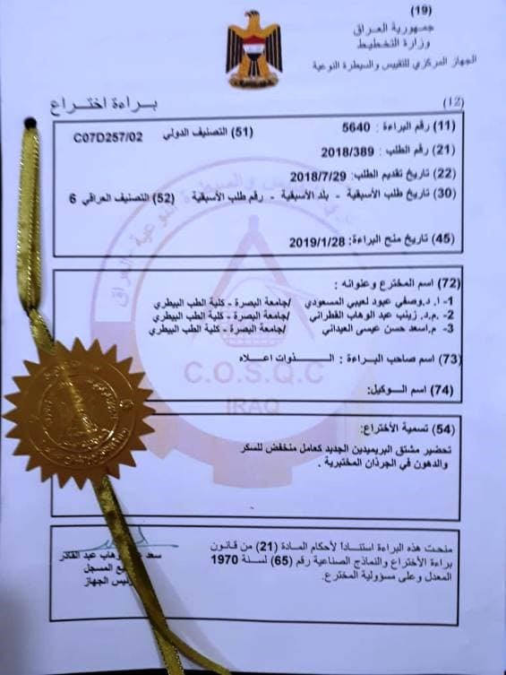 حصل فريق بحثي في كلية الطب البيطري بجامعة البصرة على براءة اختراع لتمكنه من تحضير مشتق مخفض للسكر.