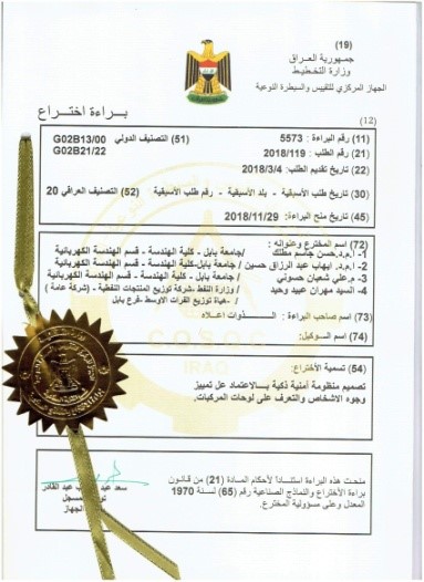حصل فريق بحثي في كلية الهندسة بجامعة بابل، على براءة اختراع لتصميمه منظومة أمنية ذكية بالاعتماد على تمييز وجوه الأشخاص والتعرف على لوحات المركبات.