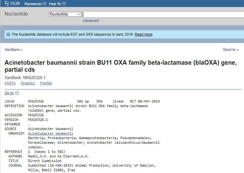 وقال رئيس الفريق العلمي الدكتور علاء هاني الجراخ ، إن هذه التسجيلات محفوظة في قاعدة بيانات عامة في البنوك العالمية للجينات خلال العام الحالي2019 ، مبينا أنه تم تسجيل خمسة عشر جينا عائدة لأنزيمات الكاربابنيميز نوع (blaOXA) لخمس عزلات لبكتريا Acinetobacter baumannii معزولة من عينات سريرية مختلفة حيث تم الحصول على الأرقام التسلسلية Accession Numbers للعزلات المسجلة في NCBI ، وأنه لا توجد دراسات سابقة تؤكد تسجيل هكذا نوع من تتابع القواعد النيتروجينية
