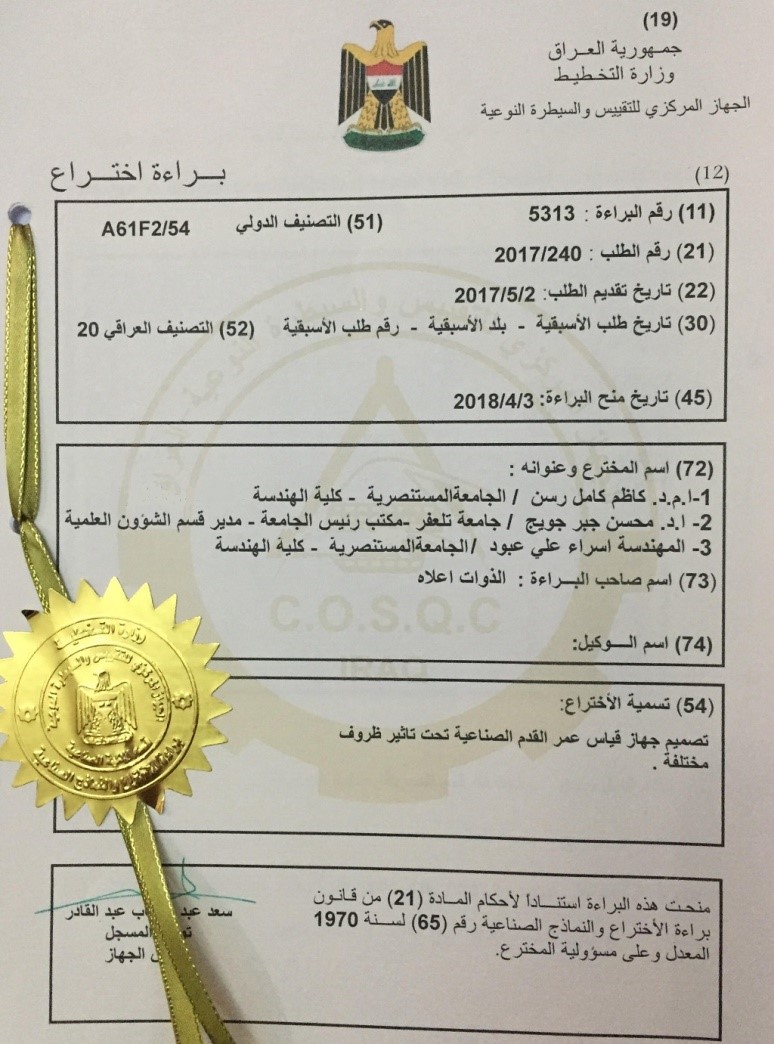 حصل فريق بحثي مشترك في جامعتي المستنصرية وتلعفر، على براءة إختراع، لتمكنهم من تصميم جهاز لقياس عمر القَدَم الصناعية تحت تأثير ظروف مختلفة.