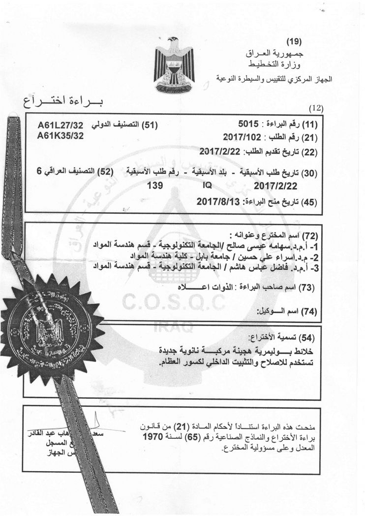 حصل فريق بحثي مشترك من جامعتي بابل والتكنولوجية على براءة اختراع عن تحضير خلائط بوليمرية هجينة مركبة نانوية جديدة تستخدم للاصلاح والتثبيت الداخلي لكسور العظام.